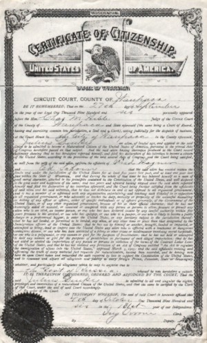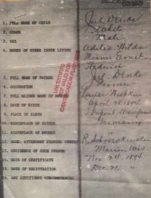 This first photo is a picture of my Great Grandparents, Julius Denke and Louise Vaeshke The photo was most likely taken on their farm in Wisconsin. Beneath the photo is Julius's Certificate of Citizenship dated 9/27/1906. His former country of residence is listed as Russia. It is my belief that he is one of the German farmers who was attracted to offers of free farmland from Russia. Ultimately, the Germans were persecuted in Russia and many found their way to the United States. He was German speaking, and most likely came from Silesia, which currently part of Poland.